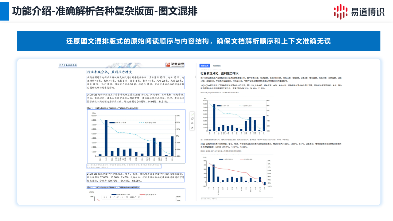 ●图文混排:在研报或技术手册中,系统能智能识别图文区域,确保文本围绕图片或图表的顺序是正确的,避免上下文错乱。