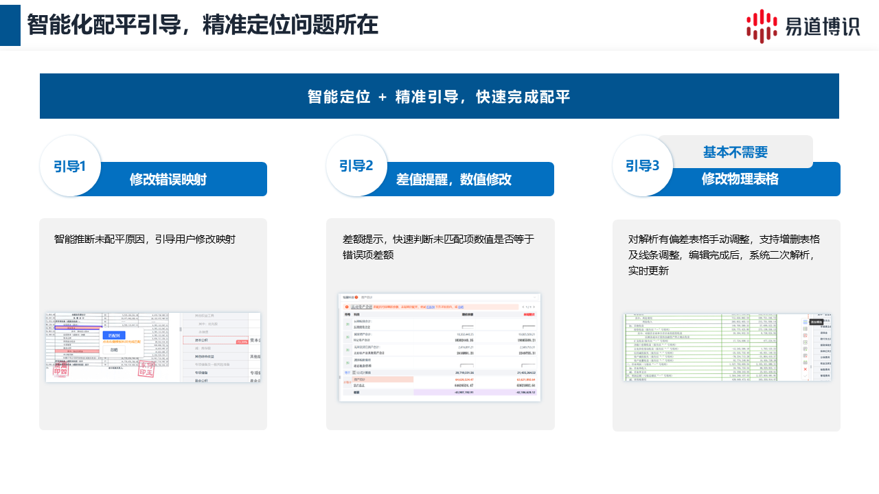 A:通过界面的智能化配平引导,系统允许用户从“修改错误映射”、“依据差值提醒修改数值”,甚至“直接手动编辑原图表格让系统二次解析”三个层面向下调整归一数据,过程可视化且步骤清晰。