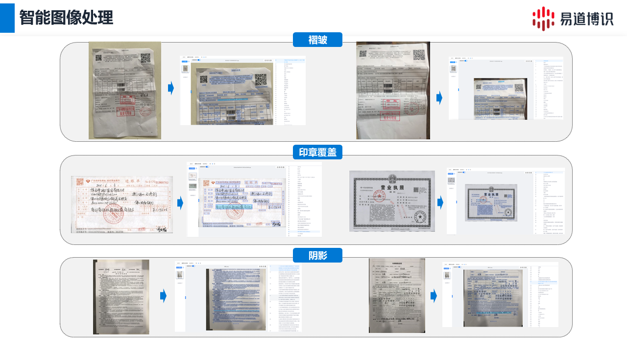 ● 智能图像处理:针对银行业务中常见的低质量图像,系统内置智能图像预处理功能,可自动完成图像增强、阴影与水印去除、印章干扰识别等操作,有效应对文档褶皱、印章重叠、低对比度等复杂情况,从而显著提升识别准确率。