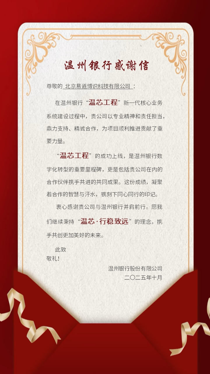 近日,易道博识收到了来自温州银行的感谢信,信中对易道博识团队在温州银行新一代核心业务系统“温芯工程”建设过程中所展现的专业能力与服务精神给予了高度评价。