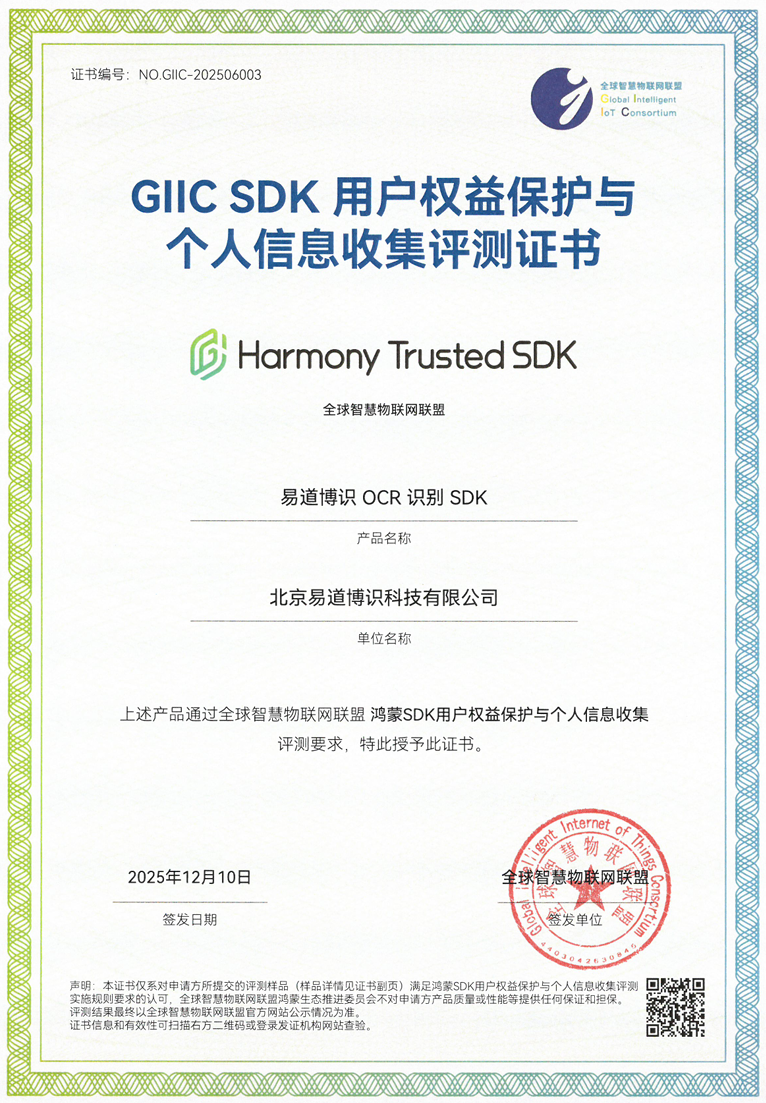 近日,易道博识旗下核心产品——易识移动端识别SDK,通过全球智慧物联网联盟(GIIC)鸿蒙SDK权威认证,易道博识将以更安全可信的卡证识别能力,持续赋能企业用户融入鸿蒙生态。