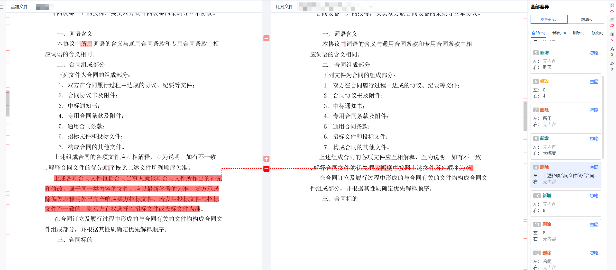 使用智能文档比对系统,100页文档比对在3分钟内即可完成,比对结果高亮展示,“增、删、改”分类汇总,支持用户双屏对照浏览与自定义比对规则,合同差异一目了然。