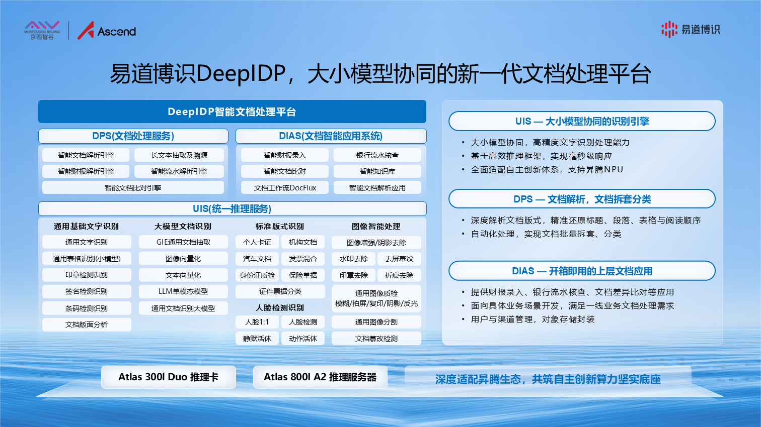 尤为值得关注的是,DeepIDP已深度适配昇腾,实现与底层硬件的无缝对接,为客户提供了一条真正低门槛、高可靠的业务平滑迁移路径。