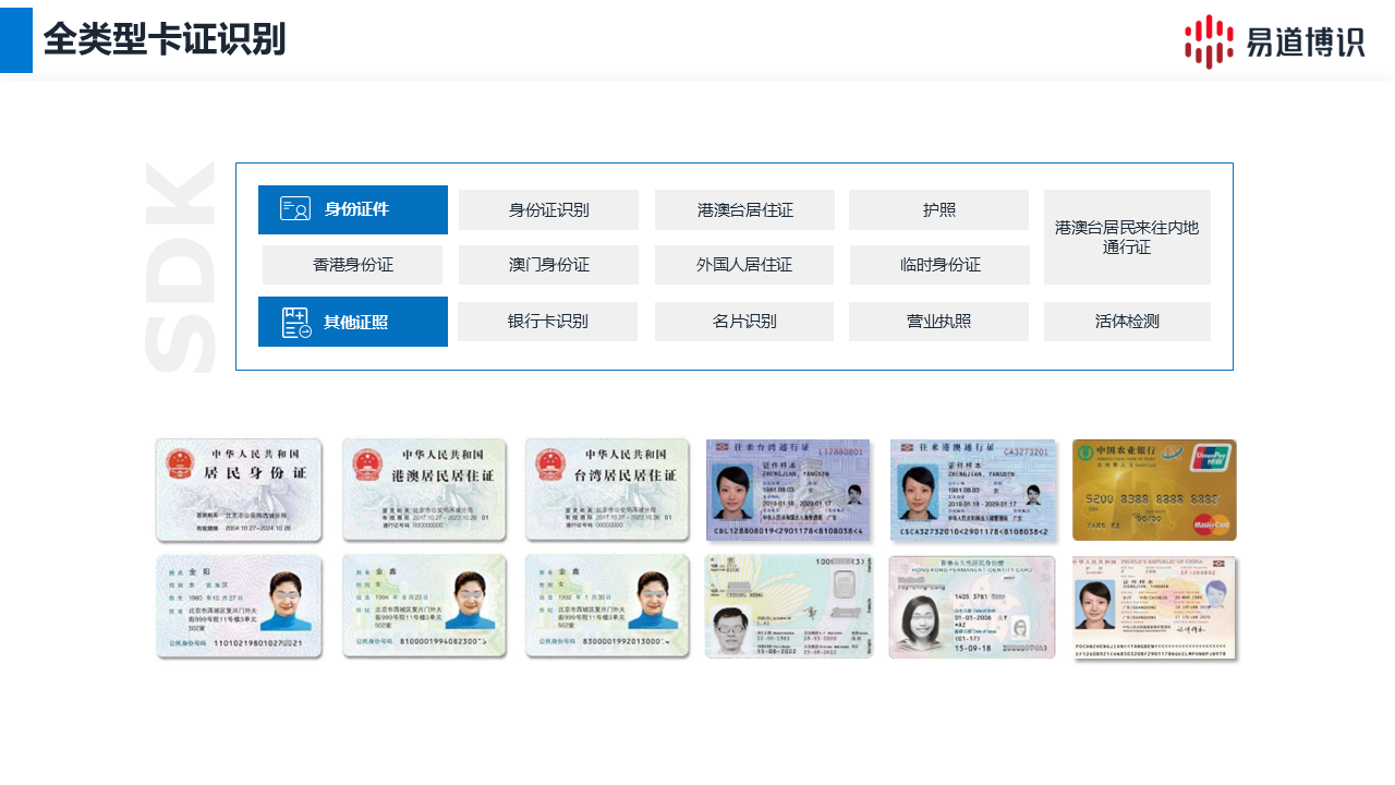 易识移动端识别SDK基于深度学习技术研发,是一款在移动端即可实现服务器端综合性能的智能产品。支持身份证、银行卡及各类通用证照的毫秒级识别,识别准确率超99.5%。