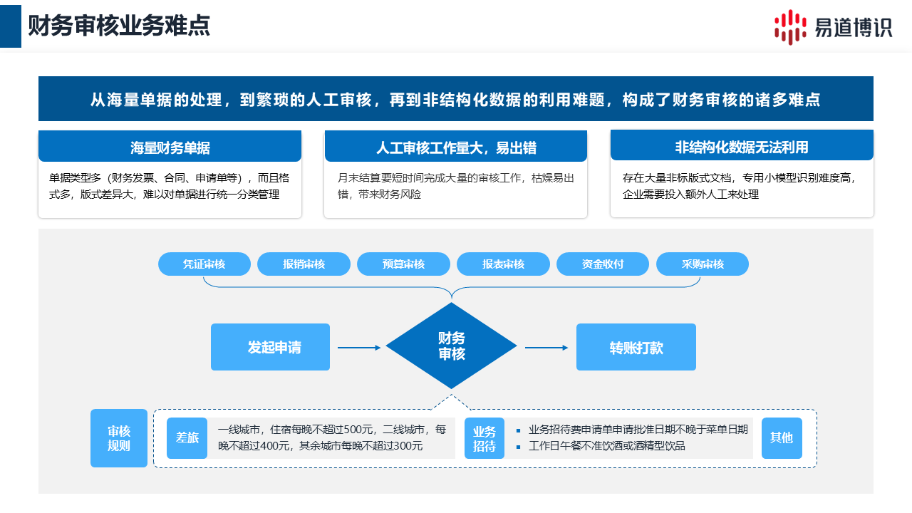 易道博识推出智能财务审核方案,文档自动分类、关键信息抽取、智能审核一站搞定。